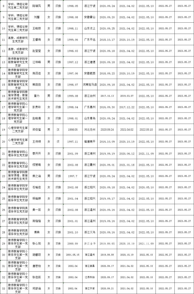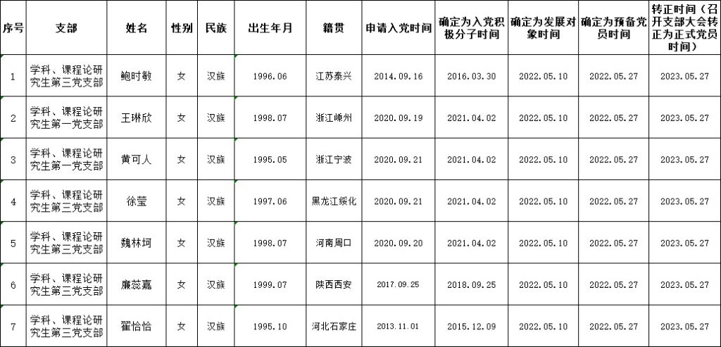 根据《中国共产党发展党员工作细则》中发展党员的文件要求,经对鲍时敏等39名同志的预备党员转正条件、转正程序等进行严格审查。2023年6月6日,学院党委会集体审议讨论了鲍时敏等39名同志的转正问题。党委委员共7名,实到会7名。经逐个审议和表决,7名党委委员一致认为鲍时敏等39名同志已具备正式党员条件,同意批准按期转为中共正式党员,党龄从预备期满转为正式党员算起。具体名单公布如下: