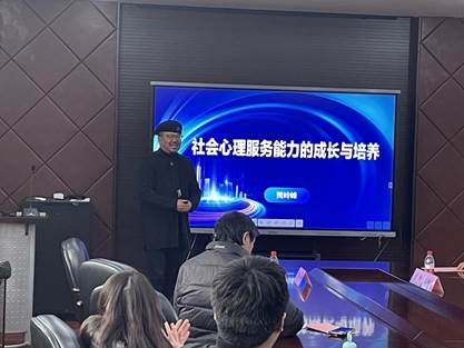 承办的讲座以“社会心理服务能力的成长与培养”为题,由上海体育大学心理学院贺岭峰教授主讲。