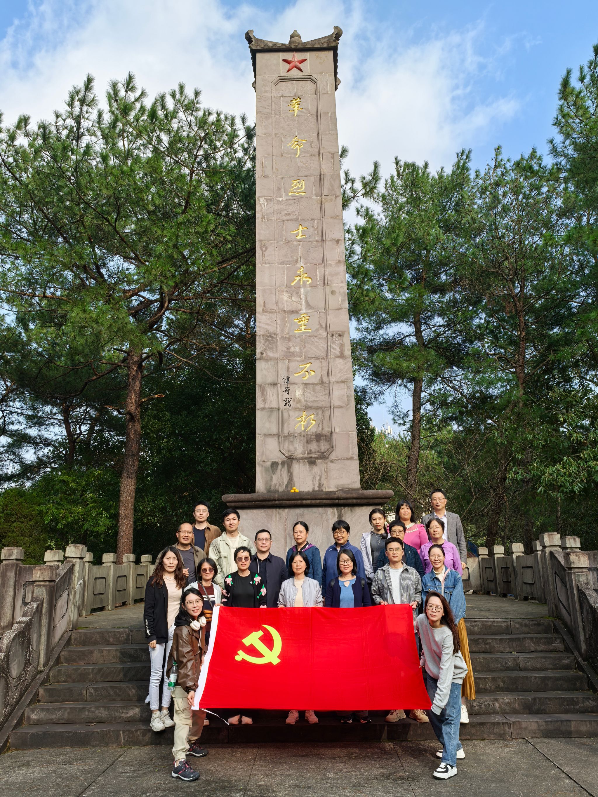 当天,阳光晴朗,钟山红色主题公园更是明亮温暖,如同烈士庇佑。全体党员同志登上百级台阶,在烈士纪念碑前默哀缅怀。烈士墓碑,英魂长存,部分烈士仅有一座衣冠冢,这令党员同志们在白玉碑前扼腕叹息、驻足沉思。