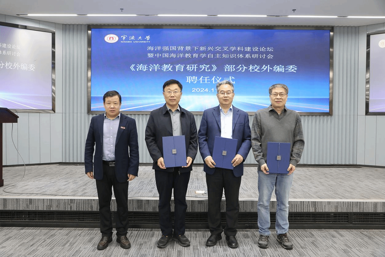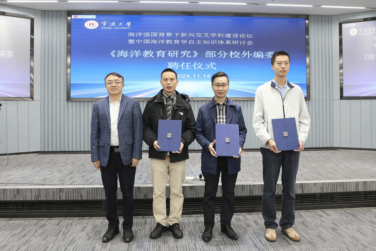 督评中心主任、海洋教育研究中心主任、《海洋教育研究》主编刘训华教授为校外编委刘来兵、刘超、刘齐颁发聘书。