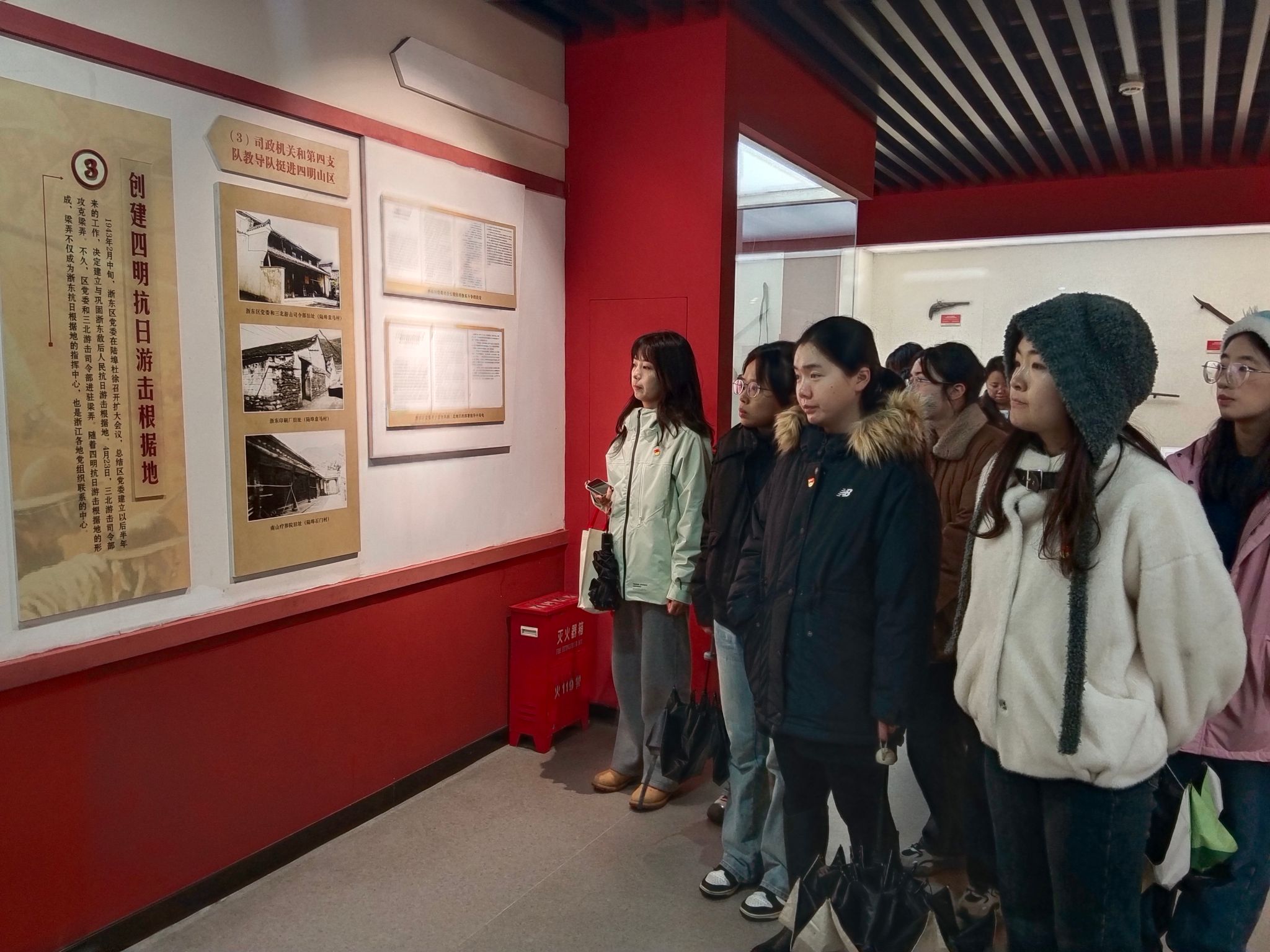 随后,伴着绵绵细雨,同志们怀着崇敬之心来到浙东抗日根据地旧址群,仔细聆听讲解员讲述那段烽火岁月,先辈们的英勇事迹仿佛透过雨幕在眼前重现。雨中的古旧建筑更显沧桑厚重,仿佛在默默诉说着历史的艰辛。师生们不时驻足交流感悟,深刻体会到胜利的来之不易,也更加坚定了传承红色基因、为实现中华民族伟大复兴而团结奋斗的决心。