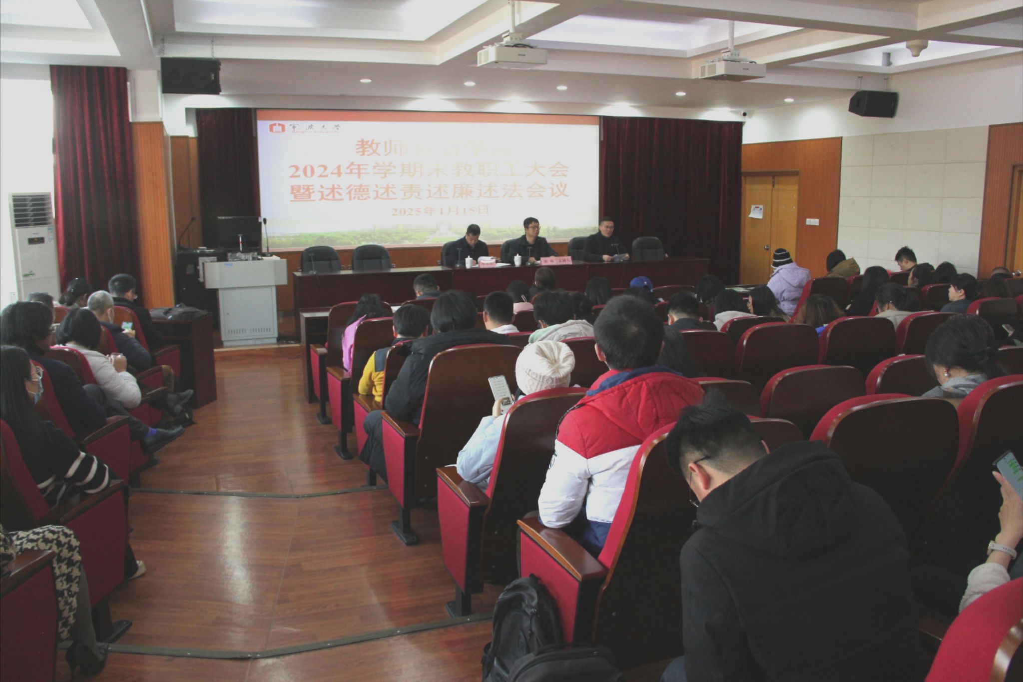 2024年学期末教职工大会暨述德述责述廉述法会议在教育楼211会议室举行。会议由院党委书记张林主持,院党政班子成员及全体教职工参会。