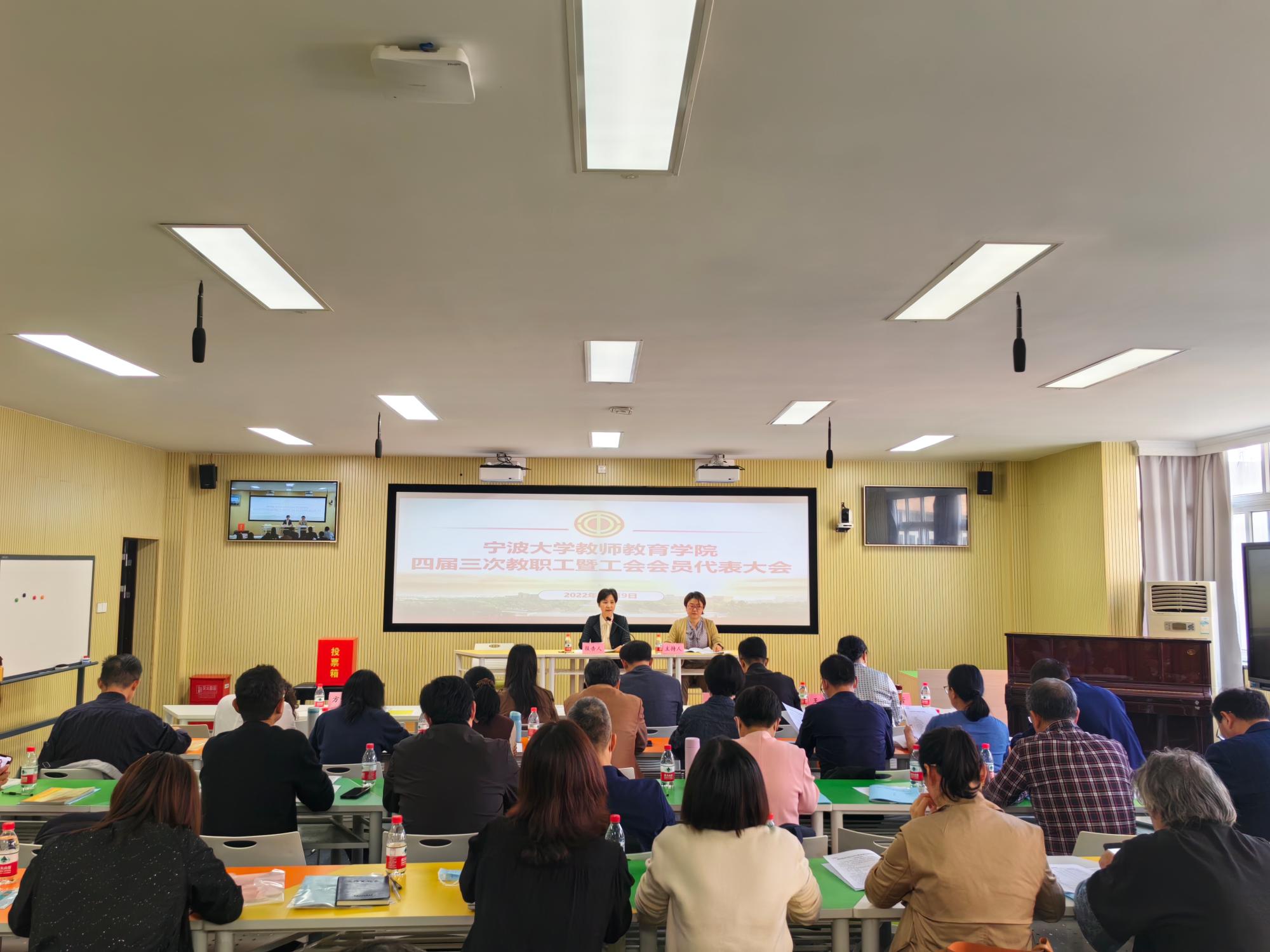 四届三次教职工暨工会会员代表大会在实验楼306智慧教室顺利召开。会议由学院分工会主席陈蕾主持,学院党委书记方莹芬为会议执行主席。会议应到代表44人,实到42人,因事因病请假2人。