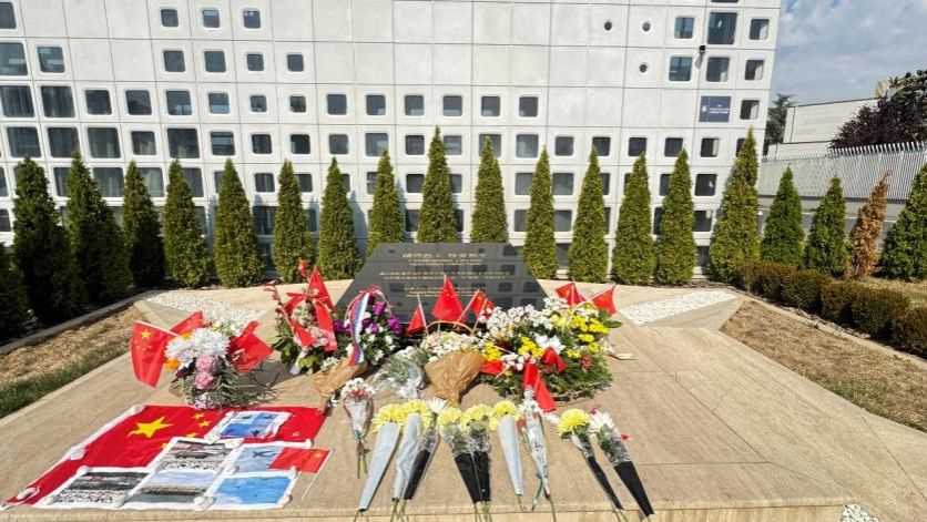 在贝尔格莱德街头,中国驻南联盟使馆旧址前的纪念碑巍然矗立,鲜艳的五星红旗在微风中轻轻摇曳,纪念碑前摆满了鲜花,是来自五湖四海的同胞们对烈士的深切缅怀。“缅怀烈士 珍爱和平”的字样在阳光下格外庄重。在纪念碑前,放置了数张“九三阅兵”东风导弹方队照片。这些见证中国国防力量历史性飞跃的照片,与纪念碑上“缅怀烈士 珍爱和平”的铭文静静相对,仿佛在进行一场跨越二十六年的对话。当年烈士们用生命捍卫的国家尊严,今日已有强大国力作为坚实后盾。