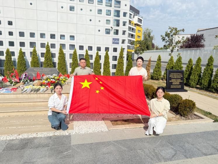 随后,师生们怀着崇敬的心情,庄重地展开了鲜艳的五星红旗。红色的旗帜在蓝天下格外夺目,无数先烈用热血染就的颜色,象征着国家的尊严与荣耀。在庄重地展开五星红旗后,师生们列队肃立,合唱《歌唱祖国》。歌声激荡在贝尔格莱德晴朗的上空,这歌声既是对英烈的庄严承诺,也是对和平年代的深情礼赞。教师党员刘鑫副教授表示:“在烈士长眠之地唱响这首象征民族精神的歌曲,让跨越时空的爱国情怀得到了最真切的升华。”
