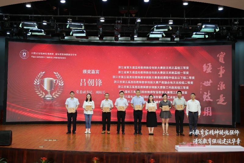 获得2024年宁波市高等教育教学成果奖一等奖的张宝歌老师(右六)、邵光华老师(左六)、刘训华老师(右五)颁奖
