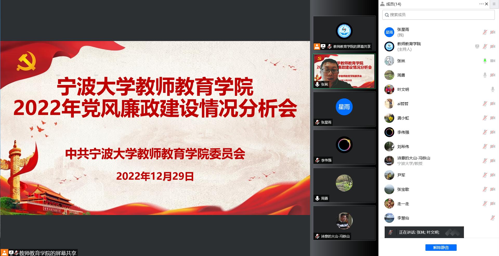 在线召开2022年党风廉政建设情况分析会,校纪委委员叶文明出席会议并讲话。教师教育学院党政班子成员、党委委员、纪委委员参加了会议。