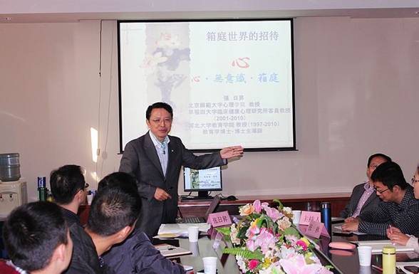 院长贺国庆教授的邀请,北京师范大学张日昇教授莅临心理学系暨研究所,在博观楼401会议室主持了人类行为与心理研究中心的学术沙龙,并为心理学教师、研究生及本科生作了题为“心•无意识•箱庭——箱庭治疗的原理与应用”的主题演讲。在学术沙龙开始之前,张日昇教授向心理学系暨研究所赠送了自己出版的学术专著《咨询心理学》和《箱庭疗法》,并向贺院长和张锋教授赠送了他的书法作品。