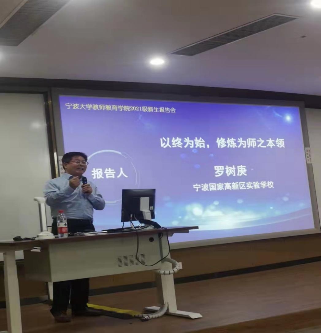 罗树庚老师是宁波国家高新区实验学校教育集团党支部书记、校长,浙江省特级教师,正高级教师,宁波市名师、名校长,甬派教育管理名家培养对象,宁波市领军拔尖人才,浙江省师德标兵,全国科研先进工作者,全国青年教师教学艺术大赛一等奖获得者。本次讲座中,罗树庚校长由浅入深,层层递进。讲座还未开始便播放了两个视频来吸引同学们的注意,并自然地抛出了问题:“我是谁”,“我要去哪儿”,继而发问“我准备怎么去”。围绕于此,罗校长告诉了我们当前教师竞聘的激烈,也劝诫我们如何才能不虚度未来的四年。因此,罗校长提出了“沉潜积淀”“练基本功”“勤读善思爱写”“专题阅读”“系统思考”“目标引领”等六方面的建议,每一个建议都由一个个生动的故事和案例连接,让在场的师生深受启迪。