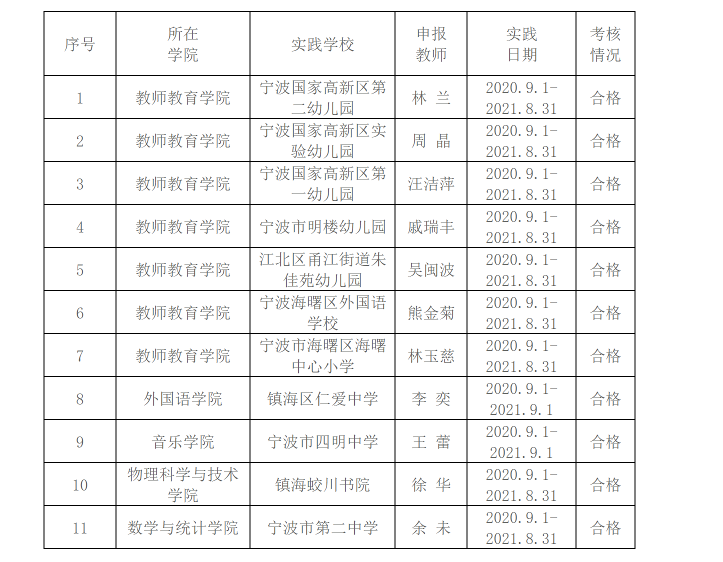 根据《成年人电影 教教师教育实践能力培养实施办法(试行)》(宁大政〔2020〕40号)文件,教务处对2020-2021学年教师教育实践能力培养考核合格的相关人员进行公示,具体名单如下: