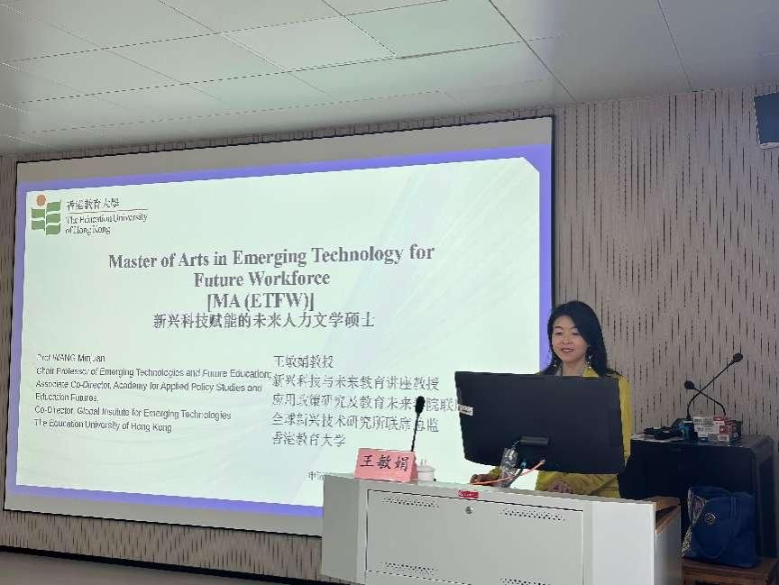 宣讲会上,王敏娟教授系统介绍了香港教育大学在人工智能教育领域的全球竞争力。她指出,该项目构建了“人工智能(AI)、扩展现实(XR)、物联网(IoT)与机器学习”四大技术为核心的课程体系,涵盖“未来工作趋势”“数字领导力”“知识管理中的AI应用”等前沿议题。课程由哈佛大学Chris Dede教授、斯坦福大学Paul Kim博士等国际顶尖学者联袂授课,并引入科大讯飞研究院执行院长王士进等行业专家参与实践教学,形成“学术导师+产业导师”的双导师制培养模式,打造产学研协同育人平台。此外,王教授还对该项目申请要求、学费及职业发展等多维度进行了深入而细致的解读。