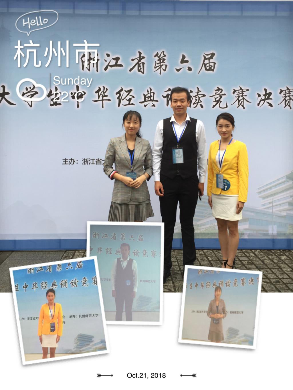 10月20日-21日,由浙江省大学生科技竞赛委员会主办、杭州师范大学承办的“浙江省第六届大学生中华经典诵读竞赛”在杭州师范大学举行,经过“中华经典朗诵”、“即兴演讲”与“回答问题”三个环节的角逐,我校6位参赛选手共获得一等奖1项、二等奖2项、三等奖3项的好成绩。