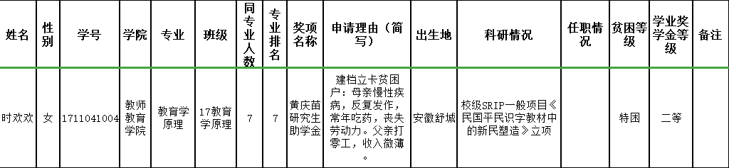 研究生院考虑到成年人电影 研究生贫困生总量较大,给予成年人电影 增补一名“绣山清寒优秀学生奖学金”名额。学院研究生奖助学金评审委员会办公室根据前期申报情况,拟推荐时欢欢为“绣山清寒优秀学生奖学金”推荐学生,现予以公示。