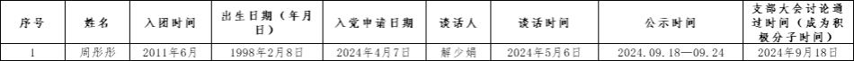 根据学院发展教工党员为入党积极分子有关规定的要求,经团委推荐审议,现进行拟推荐名单公示,公示时间为2024年9月18日起到2024年9月24日。