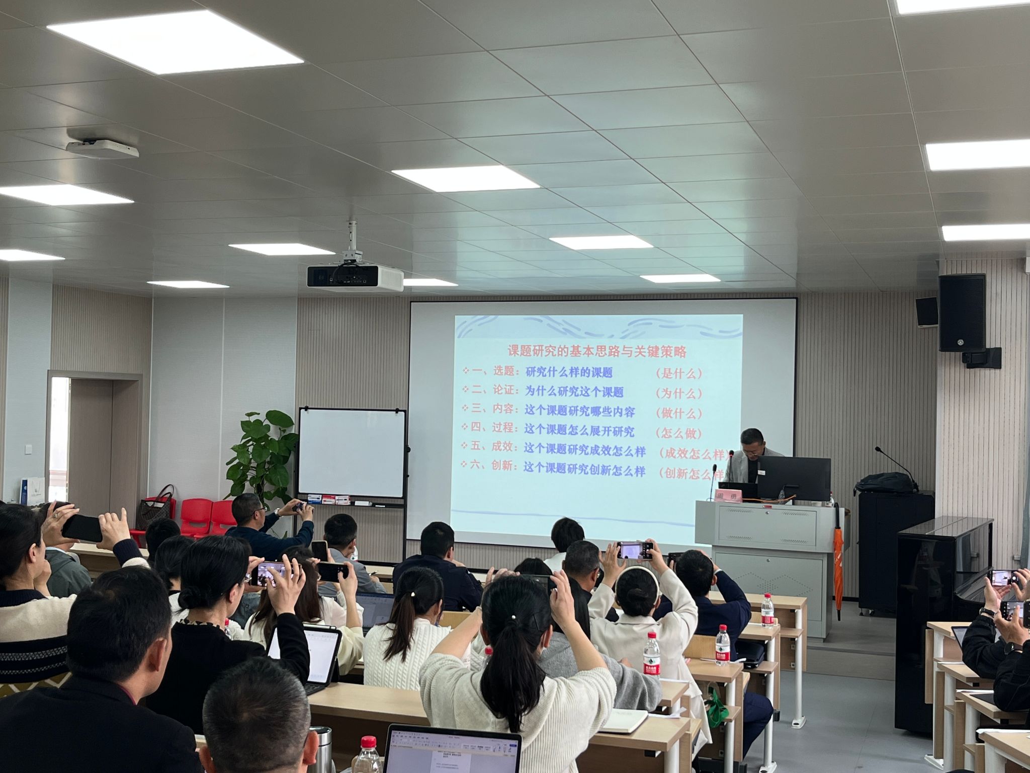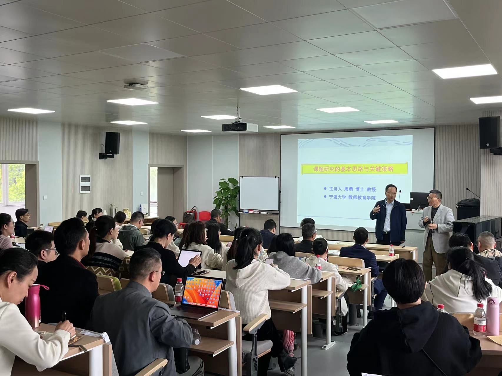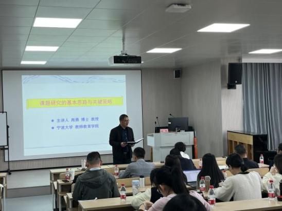 周勇教授、焦岚教授分别主讲。周勇教授围绕选题、论证、内容、过程、成效、创新六个方面,通过专业又风趣的语言、环环相扣的问题、生动契合的课题分享、贴近生活的案例分析,将课题研究的基本思路与关键策略抽丝剥茧、层层递进地展开。焦岚教授围绕中小学教师教科研中的突出问题、教学科研项目现状、中小学教师开展项目研究的路径选择、教育学类学术论文撰写规范等方面展开,分享一线教师如何开展教育教学论文写作和发表。