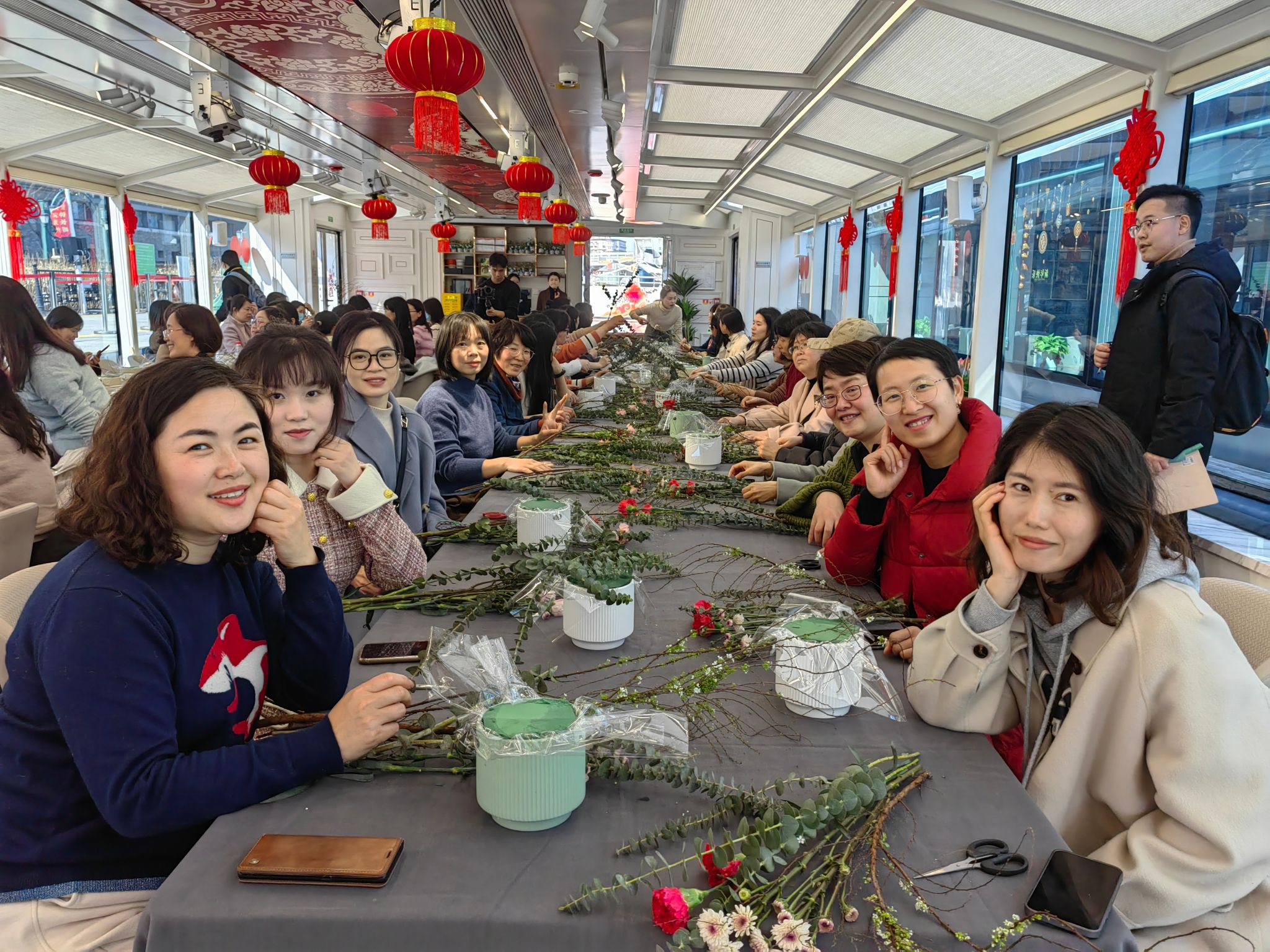 插花课程结束后,游船缓缓出发,带着老师们的欢声笑语开航游览三江秀丽美景,往返数十里,流水曲三江。以波光粼粼的江水与两岸风光为背景,老师们纷纷和自己的插花作品合影,以纪念这一美好的午后。目光所及满是美丽的花景,更是如花一般灿烂的笑容。